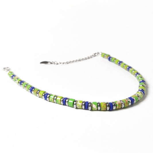 Bracciale con Pietre Dure Pasta di Diaspro Lime Ematite Argento e Inserti Blu