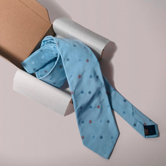 Cravatta Azzurra Pura Seta con Microdisegno Fiorellini Ricamati Blu Rosso