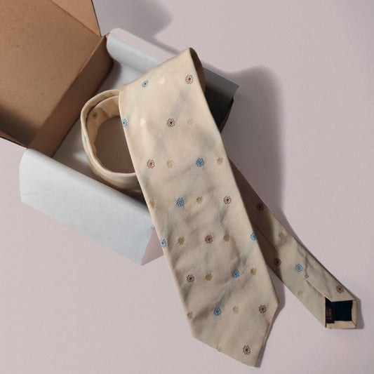 Cravatta Beige Pura Seta con Microdisegno Fiorellini Ricamati Marrone Azzurro