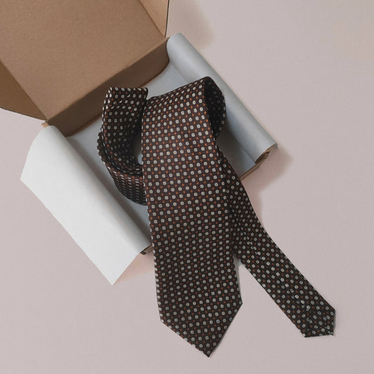 Cravatta Marrone con Microdisegno Fiorellini Bianchi e Arancio